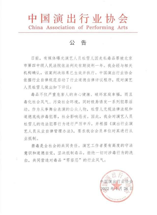 毒品不仅严重危害人的身心健康、破坏家庭幸福,而且毒化社会风气、污染社会环境,同时极易诱发一系列犯罪活动。作为从事舞台表演的公众人物,杜雪儿无视法律法规和道德底线涉毒犯罪,社会影响恶劣。因此,我会对演艺人员杜雪儿的违法犯罪行为进行严厉申斥,并根据《演出行业演艺人员从业自律管理办法》,要求我会会员单位对其进行从业抵制。