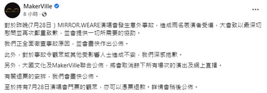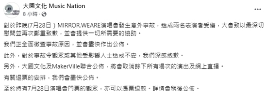 对于昨晚(7月28日)MIRROR.WEARE演唱会发生意外事故,造成两名表演者受伤,大会致以最深切慰问并再次郑重致歉,并会提供一切所需要的协助。