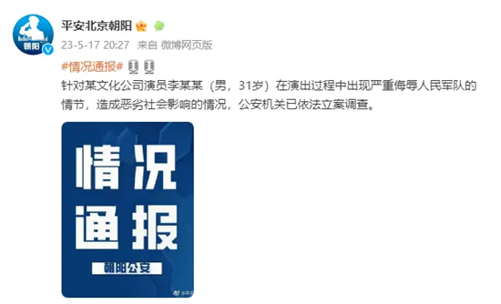 针对某文化公司演员李某某(男,31岁)在演出过程中出现严重侮辱人民军队的情节,造成恶劣社会影响的情况,公安机关已依法立案调查。