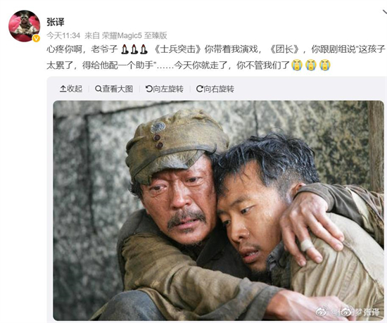 演员张译发文悼念:“心疼你啊,老爷子。《士兵突击》你带着我演戏,《团长》,你跟剧组说‘这孩子太累了,得给他配一个助手’……今天你就走了,你不管我们了”。
