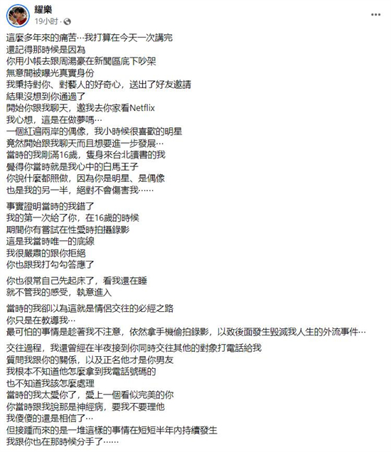 至于是否会接受炎亚纶的道歉?耀乐强调:“他这些道歉不应该是我爆料之后,他才跟我道歉,这是一个非常令人难过的点,他自己在文章里也说这几年有改变,那在哪边?是针对其他受害者吗?还是我不重要?我觉得整件事情爆料出来才做道歉,这个道歉是很没诚意的。”
