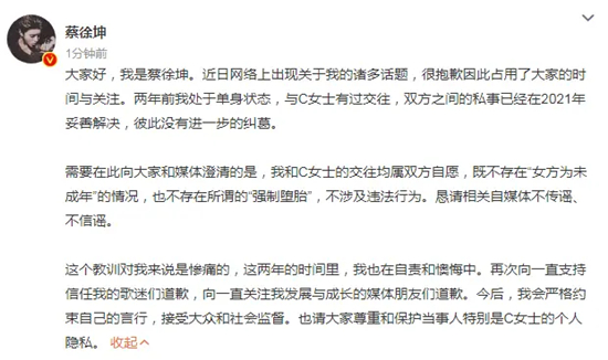 大家好,我是蔡徐坤。近日网络上出现关于我的诸多话题,很抱歉因此占用了大家的时间与关注。两年前我处于单身状态,与C女士有过交往,双方之间的私事已经在2021年妥善解决,彼此没有进一步的纠葛。 需要在此向大家和媒体澄清的是,我和C女士的交往均属双方自愿,既不存在“女方为未成年”的情况,也不存在所谓的“强制堕胎”,不涉及违法行为。恳请相关自媒体不传谣、不信谣。 这个教训对我来说是惨痛的,这两年的时间里,我也在自责和懊悔中。再次向一直支持信任我的歌迷们道歉,向一直关注我发展与成长的媒体朋友们道歉。今后,我会严格约束自己的言行,接受大众和社会监督。也请大家尊重和保护当事人特别是C女士的个人隐私。