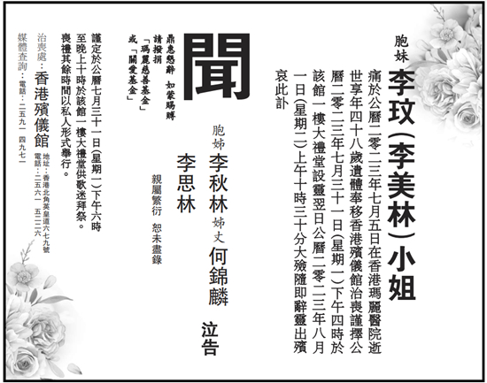 公开的讣闻以白底黑字呈现,左右角有黑白的玫瑰等花卉图案。讣闻上写道:李玟2023年7月5日于香港玛丽医院逝世、享年48岁,遗体将移送至香港殡仪馆治丧,并于7月31日下午4时在殡仪馆1楼大礼堂设灵,隔天(8月1日)上午10时30分出殡。另外,灵堂开放31日下午6时至晚间10时供歌迷前来拜祭,其余时间则以私人形式举行。