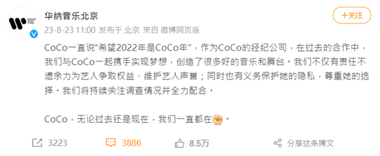 经纪公司表示,在过去的合作中,公司与CoCo一起携手实现梦想,创造了很多好的音乐和舞台。公司不仅有责任不遗余力为艺人争取权益、维护艺人声誉;同时也有义务保护她的隐私,尊重她的选择。公司将持续关注调查情况并全力配合。