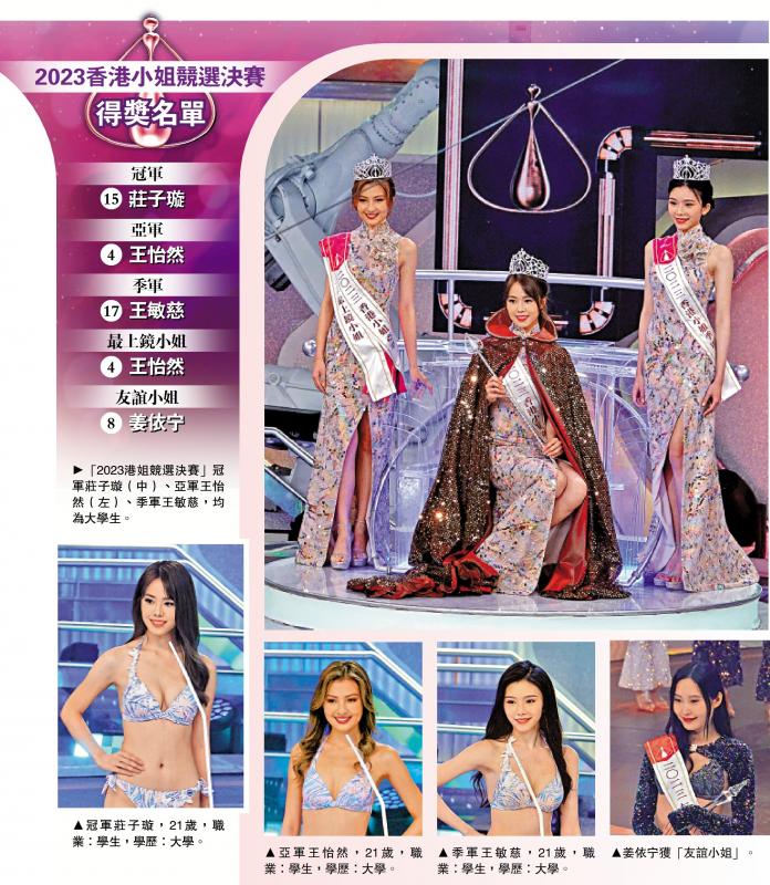由电视广播有限公司主办的“2023香港小姐竞选”决赛昨晚(27日)于将军澳电视城举行,由16位佳丽竞逐冠、亚、季军以及最上镜小姐及友谊小姐荣衔,最终15佳丽、被称为“港版IU”的庄子璇夺冠,④王怡然获得亚军和“最上镜小姐”,赛前大热的17王敏慈获季军,“友谊小姐”则在赛前由⑧姜依宁当选。