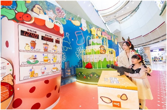 上水中心购物商场则展现中式美食的魅力,圆滚滚的吃货鸡仔一身圣诞老人装束,带领一众可爱的好友们畅游美食中庆祝佳节。商场中庭放置挂满圣诞灯饰的巨大版层层点心蒸笼,内裡装满吃货鸡仔喜爱的港式点心,拿破仑蛋糕“过三关”互动装置和曲奇蛋挞座椅于两旁点缀,港式饮茶风情配上地道甜点让人仿佛置身与亲朋好友欢聚一堂的场景。在维多利亚港烟花秀背景的衬托下,更显热闹,节日氛围更加浓厚。