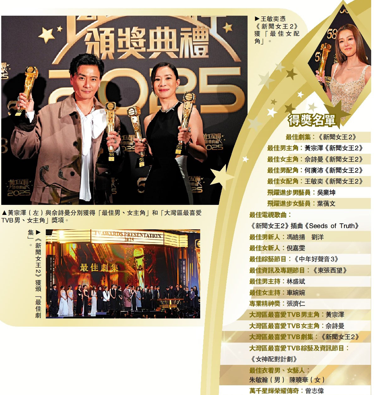 佘诗曼凭《新闻女王2》夺得“最佳女主角”,第四次获得此奖;黄宗泽亦凭此剧首度获得“最佳男主角”。《新闻女王2》还同时囊括“最佳剧集”、“最佳男配角”、“最佳女配角”及“最佳电视歌曲”等共计九个奖项。同时,曾志伟获颁“万千星辉荣耀传奇”,并将于1月21日起由现任总经理(节目内容营运)一职转任TVB新成立的咨询委员会召集人,专责向董事局提供节目内容及策略建议。