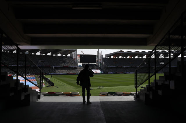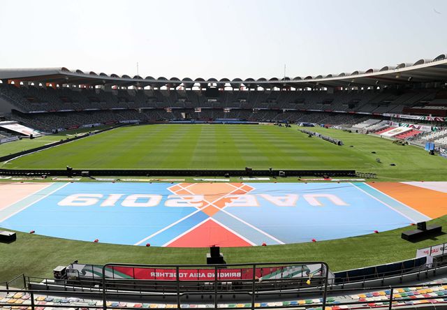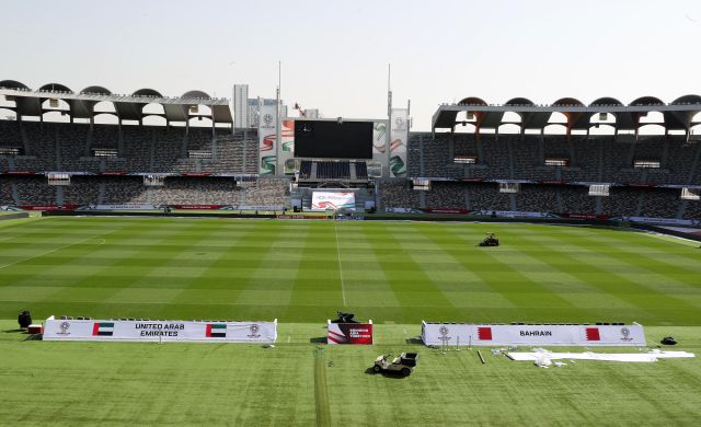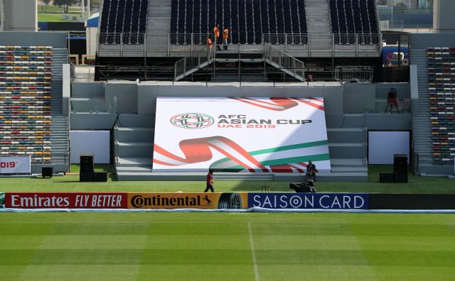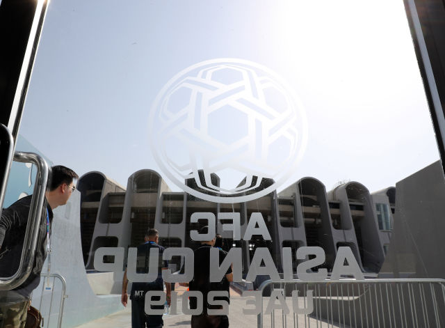 透过亚洲杯媒体工作间的玻璃门,扎耶德体育场赛场直入眼帘。