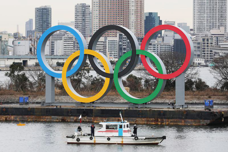 图:竖立在东京湾海面上的五环标志(新华社记者杜潇逸摄)
