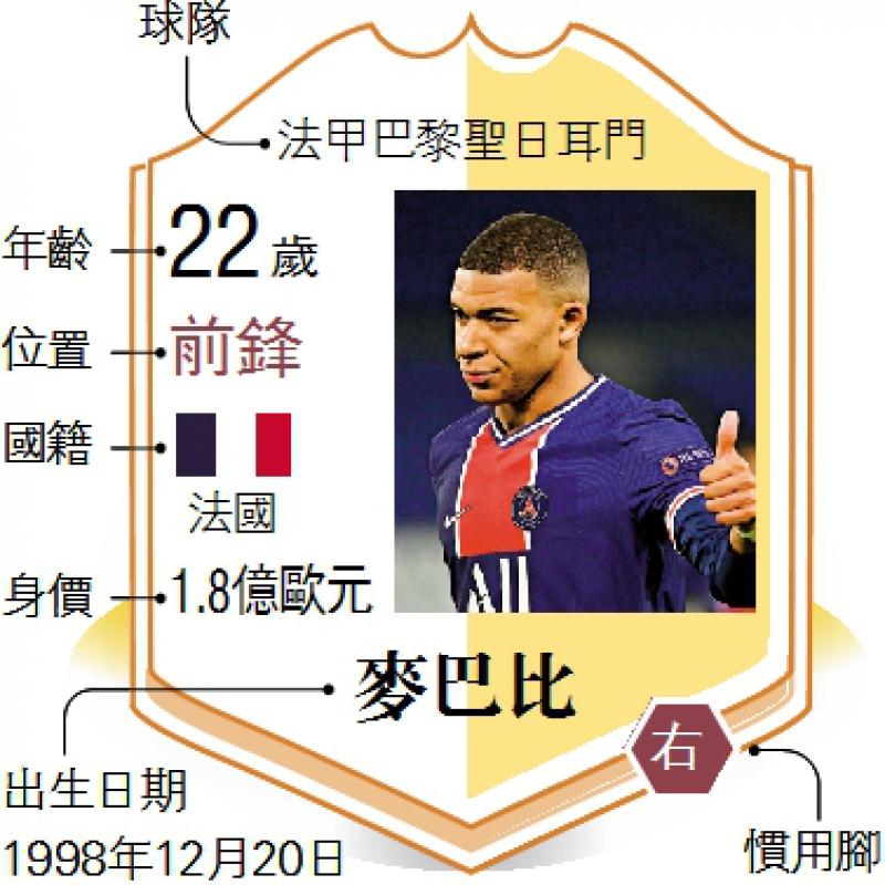 效力圣日耳门的麦巴比一直被视为最可能超越美斯和C朗拿度的新星,因为他“出闸”就赢了,他曾为法国队夺得2018年世界盃冠军。论个人荣誉和影响力,麦巴比虽仍差很远,但他在欧联16强首回合大胜巴塞一役连中三元,向大家展示实力。