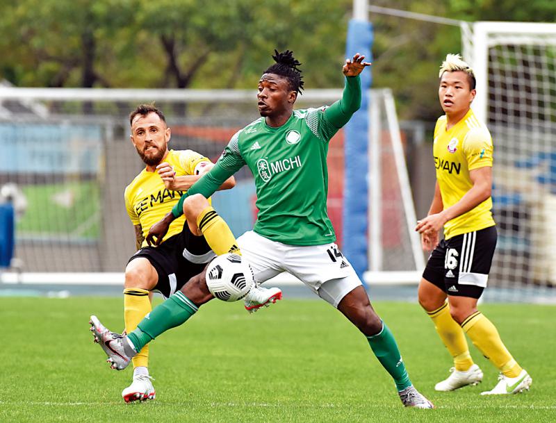 图:理文昨在联赛与愉园互交白卷。图为理文球员列斯奥(左)与愉园的艾迪比帝(中)各不相让。\新华社