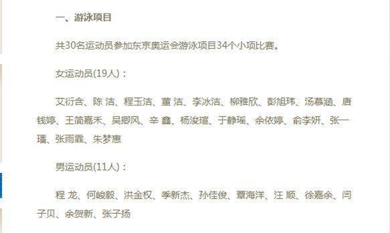 共30名运动员参加东京奥运会游泳项目34个小项比赛。其中,女运动员19名,男运动员11名。