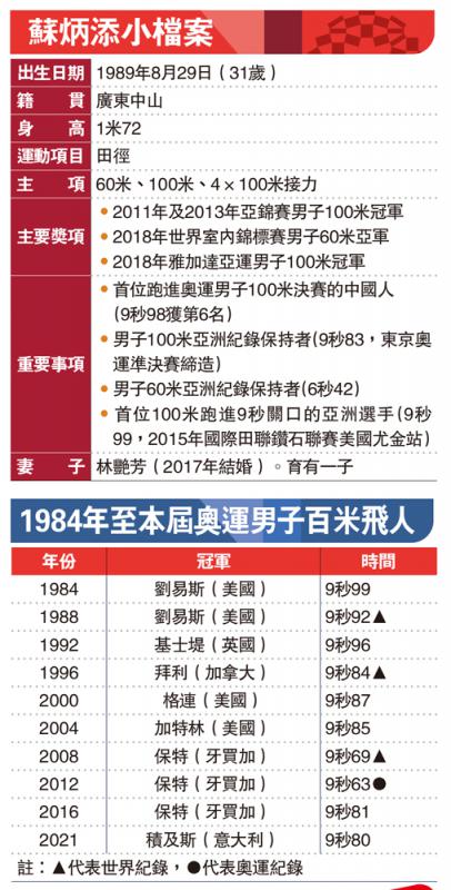 来自广东中山的苏炳添,在昨午进行的准决赛以9秒83缔造个人最佳时间兼打破亚洲纪录,在第3组准决赛首名冲线,以3组预赛中的最佳时间晋级决赛,成为首个进入奥运男子决赛的中国飞人。美国的比加在同组也缔造出9秒83的成绩,经裁判确认,苏炳添以千分之二秒的优势获得此组的第一名晋级。同组的积及斯也跑出9秒84晋级。