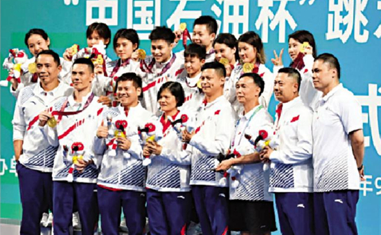 图:广东跳水队夺冠后在颁奖台上合影。\全运组委会图片