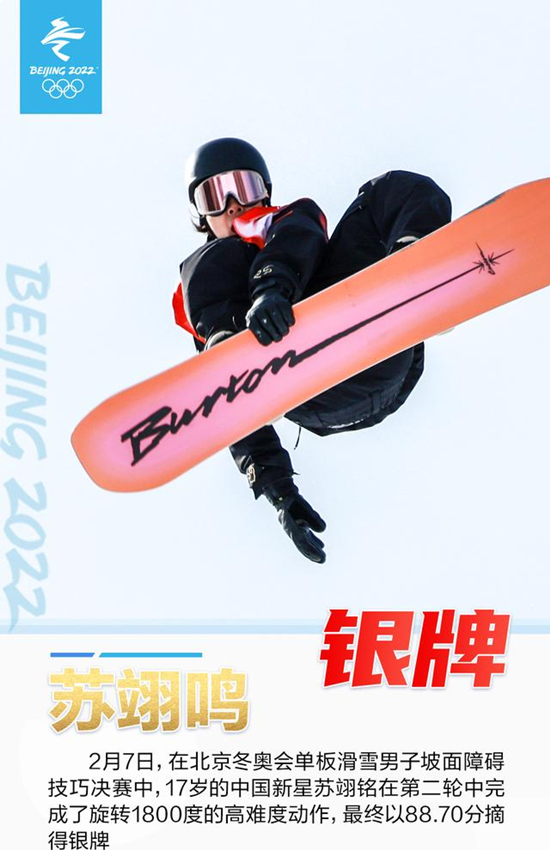 2月7日,在北京冬奥会单板滑雪男子坡面障碍技巧决赛中,17岁的中国新星苏翊铭在第二轮中完成了旋转1800度的高难度动作,最终以88.70分摘得银牌。