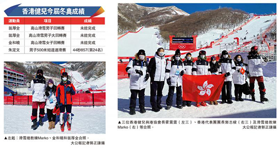 在香港滑雪运动员翁厚全昨天出战高山滑雪男子回转赛后,3名中国香港代表团的选手都已参加所有赛事,代表团亦正式结束今次北京冬季奥运之旅。虽然3人都未能在各自参加的项目晋级,但代表团团长郭志樑在总结港队本届表现时表示,3人出战冬奥已是香港一大突破,各人经今次参赛都会有所成长,他又谈到政府将会在白石体育园兴建符合国际赛事要求的溜冰场,他预计可以令滑冰项目,包括短道速滑在香港更有效地发展。