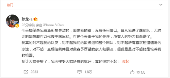 中国短道速滑运动员@孙龙-L 16日深夜更新了微博:
