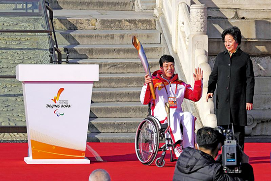 2日下午,北京天坛公园祈年殿南广场洋溢着喜庆祥和欢乐的气氛。15时许,火炬接力火种汇集暨火炬传递起跑仪式开始,现场奏起中华人民共和国国歌和国际残奥委会会歌。在全场观众的期盼中,9名代表分别手持从9个地方采集的火种,包括在冬残奥会发源地英国曼德维尔采集的火种、北京盲人学校采集的“光明之火”、望京街道温馨家园采集的“互助之火”、中国盲文图书馆采集的“希望之火”、大运河漕运码头采集的“源流之火”、八达岭古长城采集的“和平之火”、张家口创坝园区采集的“‘氢’洁之火”、黄帝城采集的“文明之火”、天坛公园采集的“夏奥之火”。9处火种共同点燃火种台,汇集成北京2022年冬残奥会官方火种。孙春兰走到火种台旁,点燃北京冬残奥会火炬,向观众展示致意,并交给第一棒火炬手、平昌冬残奥会轮椅冰壶比赛冠军陈建新。