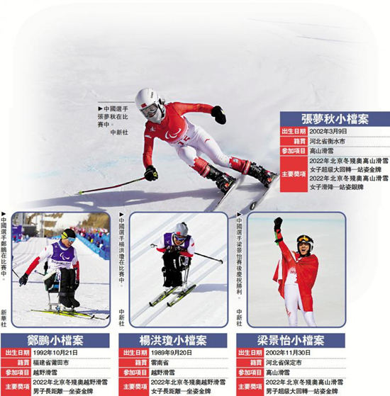 在女子超级大回转─站姿比赛中,中国选手张梦秋获得冠军,摘下中国代表团在本届冬残奥的第3金,这亦是中国在高山滑雪项目上的首枚冬残奥金牌。男子超级大回转─站姿比赛也传佳音,19岁小将梁景怡为中国代表团摘取本届冬残奥的第6金。