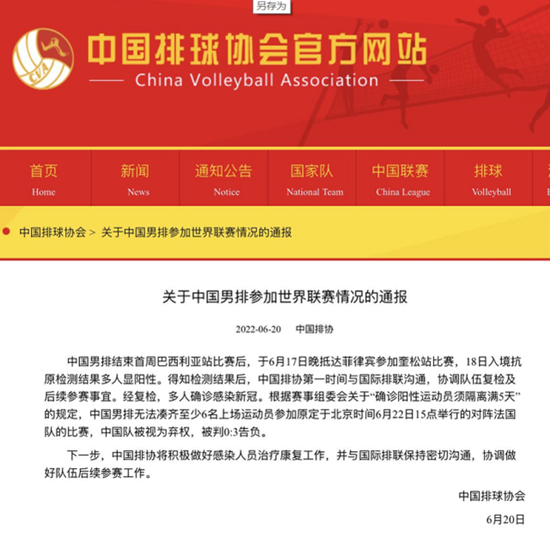 据中国排协网站消息,6月20日深夜,中国排协发布《关于中国男排参加世界联赛情况的通报》。通报称:中国男排结束首周巴西利亚站比赛后,于6月17日晚抵达菲律宾参加奎松站比赛,18日入境抗原检测结果多人显阳性。得知检测结果后,中国排协第一时间与国际排联沟通,协调队伍复检及后续参赛事宜。经复检,多人确诊感染新冠。根据赛事组委会关于“确诊阳性运动员须隔离满5天”的规定,中国男排无法凑齐至少6名上场运动员参加原定于北京时间6月22日15点举行的对阵法国队的比赛,中国队被视为弃权,被判0比3告负。