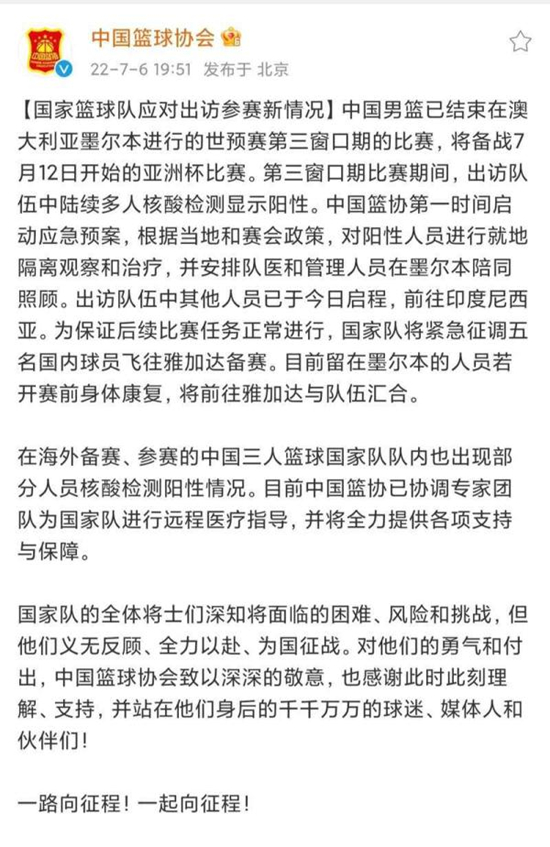 中国篮协社交媒体截图。中国男篮日前结束了在澳大利亚墨尔本进行的篮球世界杯预选赛第三窗口期的比赛,但是在比赛期间,出访队伍中陆续多人核酸检测显示阳性。为了更好地完成接下来男篮亚洲杯的比赛任务,中国男篮紧急征调翟晓川、阿不都沙拉、范子铭、高诗岩、贺希宁、姜伟泽前往雅加达。根据中国篮协透露的信息,核酸阳性人员将继续留在澳大利亚进行治疗,而其他人员则已经启程飞往印尼。按照赛程,男篮亚洲杯将于7月12日开赛,中国男篮同组对手是韩国、巴林与中国台北男篮。