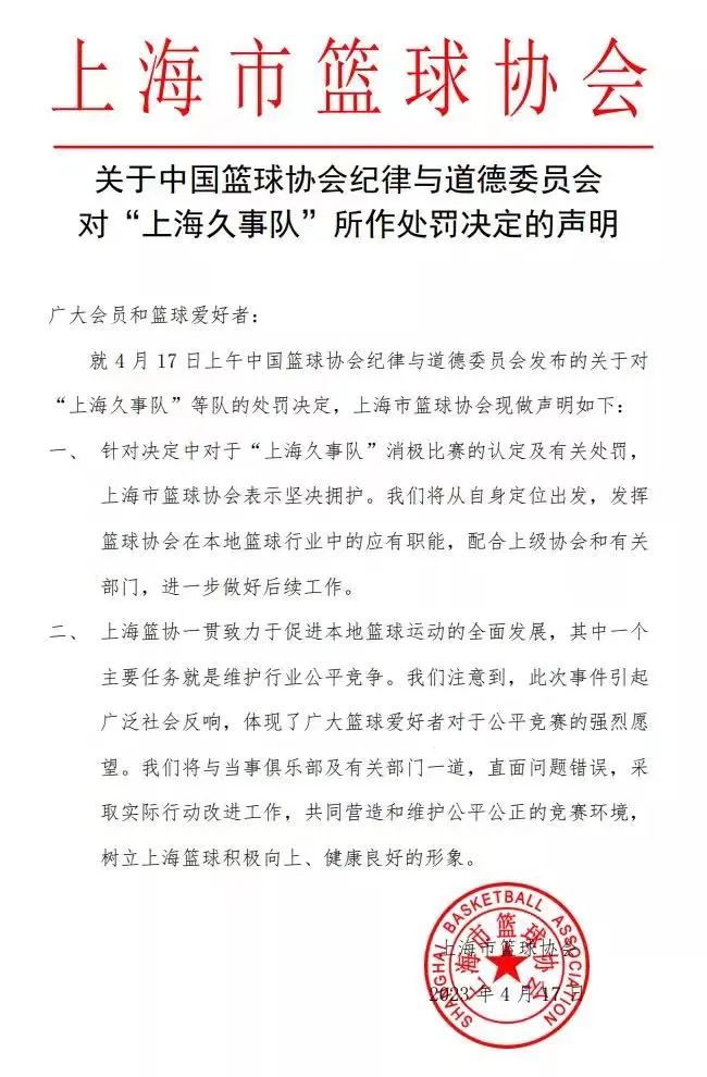 上海体育微信公众号消息,就4月17日上午中国篮球协会纪律与道德委员会发布的关于对“上海久事队”等队的处罚决定,上海市篮球协会做出声明。声明指出,坚决拥护中国篮球协会的处罚决定,并配合上级协会和有关部门,进一步做好后续工作。