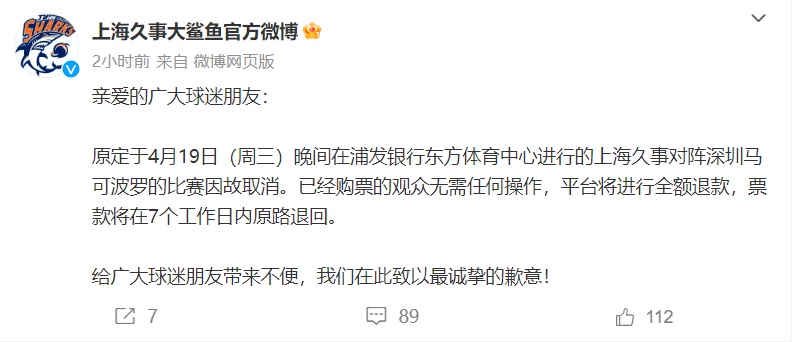 原定于4月19日(周三)晚间在浦发银行东方体育中心进行的上海久事对阵深圳马可波罗的比赛因故取消。已经购票的观众无需任何操作,平台将进行全额退款,票款将在7个工作日内原路退回。