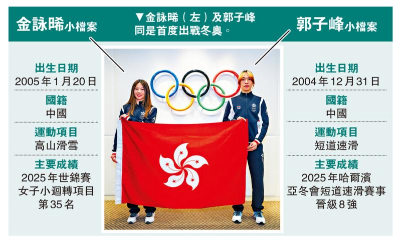 金咏晞于去年世界锦标赛女子小回转项目取得第35名,创下港队历来最佳成绩,将于本届冬奥出战高山滑雪女子回转项目。郭子峰则于去年哈尔滨亚洲冬季运动会短道速滑赛事晋级8强,他将于个人首次冬奥之旅出战短道速滑男子1000米及1500米赛事。