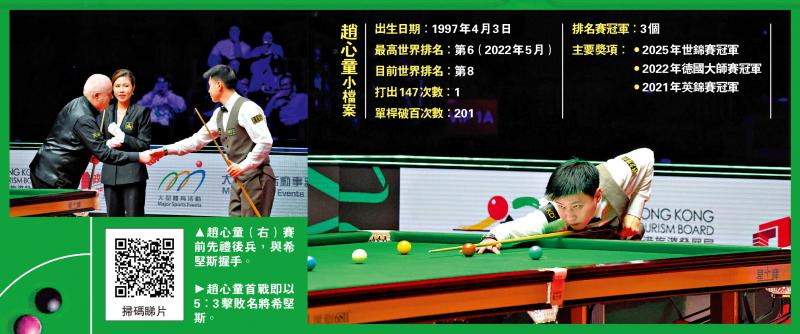 世界桌球大奖赛2026于4日在启德体艺馆展开次日赛事,“中国兵团”由2025世锦赛冠军赵心童领衔,与斯佳辉、袁思俊及庞俊旭合共4位球手亮相昨日的首圈赛事,亦是赵心童成为世界冠军后的首次来港参赛。面对苏格兰名将希坚斯,赵心童在局数落后时展现了良好的抗压水平以及不俗的防守能力,最终以局数5:3反胜晋级,次圈将对阵英格兰好手沙比,而“中国兵团”最终亦有9位球手跻身16强,成绩令人眼前一亮。\大公报记者 朱家立(文、图)