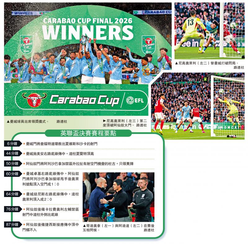 香港时间23日凌晨在温布莱球场上演的英格兰联赛盃决赛,被看低一线的曼城在经验丰富的主帅哥迪奥拿完美布局下,凭年轻左闸尼高奥莱利下半场的5分钟内顶入2球,最终以2:0打败由徒弟阿迪达带领的阿仙奴,前者更成为首位5夺英联盃的主帅,反观阿迪达在排阵、战术以至临场调动均棋差一着,过分畏首畏尾之下,终未能拿到近6年来的第2个锦标,创“四冠王”历史之梦亦告破灭,更令人忧虑是打击了球队信心,影响4月英超作客曼城的另一场“天王山决战”。\大公报记者 谭德龙