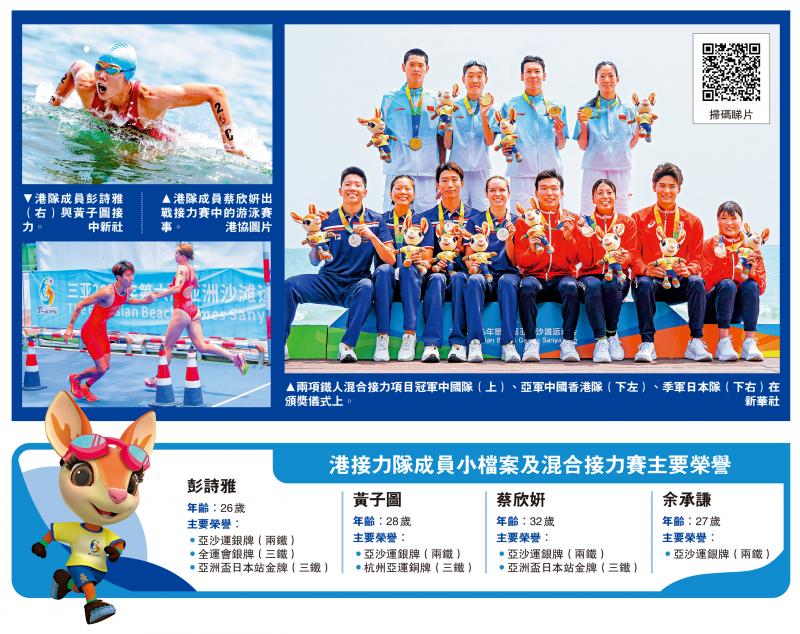 第6届亚洲沙滩运动会的两项铁人混合接力项目决赛25日顺利结束,由彭诗雅、蔡欣姸、黄子图、余承谦组成的中国香港代表队造出1小时02分35秒佳绩,为港队夺得今届亚沙运的首枚奖牌,中国香港体育协会暨奥林匹克委员会副会长兼三亚亚沙运中国香港代表团团长杨颕新亦向获奖运动员和教练团队致以由衷祝贺。国家队则以1小时1分44秒取得金牌,截至昨日赛事结束时国家队暂以9金8银2铜领先奖牌榜。\大公报记者 朱家立