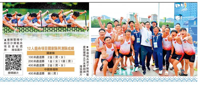 在海南三亚举行的第6届亚洲沙滩运动会,26日迎来龙舟比赛项目收官日,中国香港队在男子12人龙舟400米直道赛上获得铜牌,亦是继两项铁人混合接力赛获得银牌后,港队于今届所获的第2枚奖牌,暂时收获1银1铜。同日国家队包揽男、女子12人龙舟400米金牌后,夺得今届龙舟项目6枚金牌中的5枚。赛后,港队运动员兴奋拥抱,激动庆祝,成员林志伟表示成功取得奖牌,在于全队连日赛事中不断调整带来的回报。\大公报记者 谭德龙