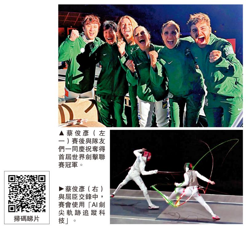 【大公报讯】男子花剑世界排名第1的中国香港队代表蔡俊彦,26日凌晨在美国洛杉矶以队长身份,带领所属队伍“Team Shield”以5:1击败对手“Team Blade”,赢得首届世界剑击联赛(WFL)冠军。