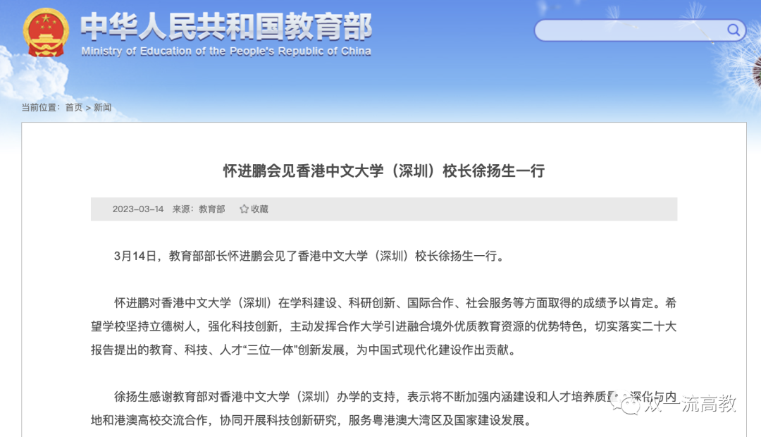 徐扬生感谢教育部对香港中文大学(深圳)办学的支持,表示将不断加强内涵建设和人才培养质量,深化与内地和港澳高校交流合作,协同开展科技创新研究,服务粤港澳大湾区及国家建设发展。