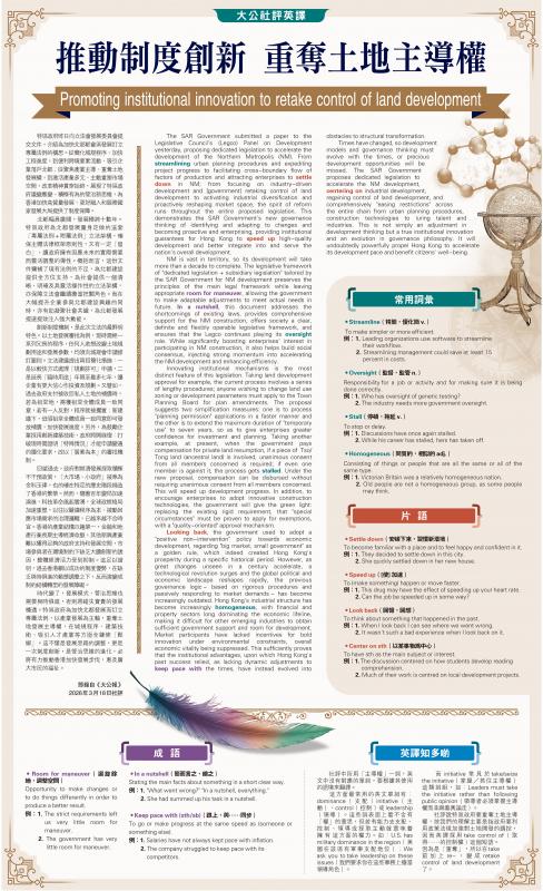 Innovating institutional mechanisms is the most distinct feature of this legislation. Taking land development approval for example, the current process involves a series of lengthy procedures; anyone wishing to change land use zoning or development parameters must apply to the Town Planning Board for plan amendments. The proposal suggests two simplification measures: one is to process "planning permission" applications in a faster manner and the other is to extend the maximum duration of "temporary use" to seven years, so as to give enterprises greater confidence for investment and planning. Taking another example, at present, when the government pays compensation for private land resumption, if a piece of Tso/Tong land (ancestral land) is involved, unanimous consent from all members concerned is required; if even one member is against it, the process gets stalled. Under the new proposal, compensation can be disbursed without requiring unanimous consent from all members concerned. This will speed up develo pment progress. In addition, to encourage enterprises to adopt innovative construction technologies, the government will give the green light: replacing the existing rigid requirement, that "special circumstances" must be proven to apply for exemptions, with a "quality-oriented" approval mechanism.
