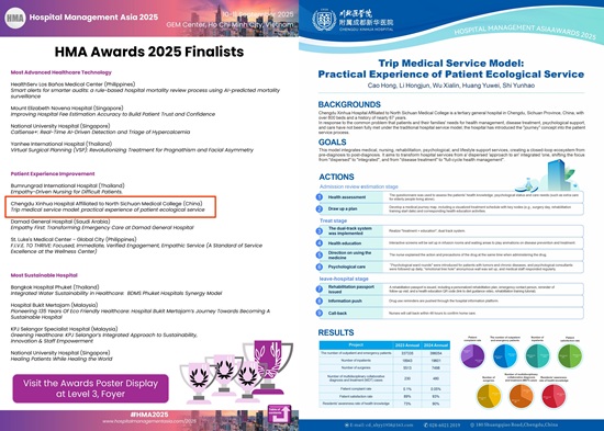 9月11日,2025年亚洲医院管理大会(HMA)颁奖典礼于越南胡志明市圆满落幕。川北医学院附属成都新华医院(以下简称“成都新华医院”)凭借“旅程式医疗服务模式:患者全生态服务的实践经验”项目,从众多参赛案例中脱颖而出,成功摘得“改善患者体验奖”金奖。