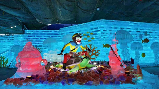 本次“双灯会”创意性地将同一IP进行差异化呈现:世园花灯以“蟠桃园-灵霄殿”天庭叙事为主线,打造南天门、炼丹炉等50余组大型灯组,并引入混合现实(MR)技术,让游客沉浸式体验动画场景;龙庆峡冰灯则聚焦“龙宫借宝”剧情,由百余名冰雕师创作包括冰龙宫在内的20组建筑、150余件冰雕,晶莹剔透地展现水下世界。两处主题虽异,却在故事线上紧密呼应。