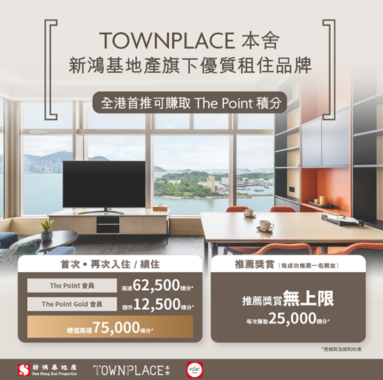 【2026年2月2日,香港】新鸿基地产(新地)(0016)旗下最具规模住宅租住品牌,TOWNPLACE 本舍,宣佈正式加盟香港最大型的商场综合会员计划 The Point ,成为集团首个引入该计划的优质租住品牌。是次合作打破传统租务框架,TOWNPLACE 本舍 以 The Point 作为连结,透过数码平台将居住体验与日常消费无缝对接,让住户轻松连系至 The Point 网络,包括近 30 个新地商场,近 3,000 间商户及 6 间“帝”系酒店。此举不仅提升了租户对品牌同集团的归属感,更将单纯的居住转化为灵活、客製化的全方位高端生活体验。