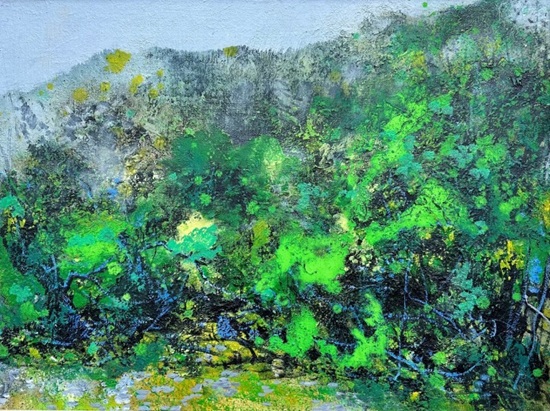 画家张徽军毕业于中央美术学院油画系,中国油画协会会员。中年后隐居黄山专注于山水风景油画创作。他的足迹遍佈黄山各个角落,从自然中汲取绘画的素材和灵感,但他的作品不是对自然的具象再现,而是通过写意和抽象的方式表达对山水精神的感悟。自然是他创作的“起点”,情感是他画面的“核心”。他的作品写意与抽象交融,大量运用泼墨、泼彩、重叠皴法等手法,让画面在抽象与具象之间自由转换,强调肌理、偶然性与画面节奏感,并融合进了西方绘画的抽象表现风格。他的油画作品颜色比传统中国山水画更强烈,常用蓝、绿、黄、赭等浓烈色彩,创造具有“沉静感”的视觉体验。情感上充满张力,有时宁静沉郁,有时澎湃奔放,表达出对天地、自然和生命的敬畏。他的作品使用油画材料,但很多作品的结构和气韵来源于中国传统山水画。不拘泥于媒介,追求的是“东方意境的当代表达”。通过欣赏他的油画作品,能直观感受到何为“中学为体,西学为用”的精髓。在画面裡他自由表现自我情感并重视偶发与直觉,强调画面的“势”与“力”,用笔粗犷、自由,有强烈的画面能量流动。他的作品表达的是山水精神与自然契合,儒道合一的东方哲学,他所追求的是一种“天人合一”与“心象自然”的境界。于他而言,艺术即是修行。