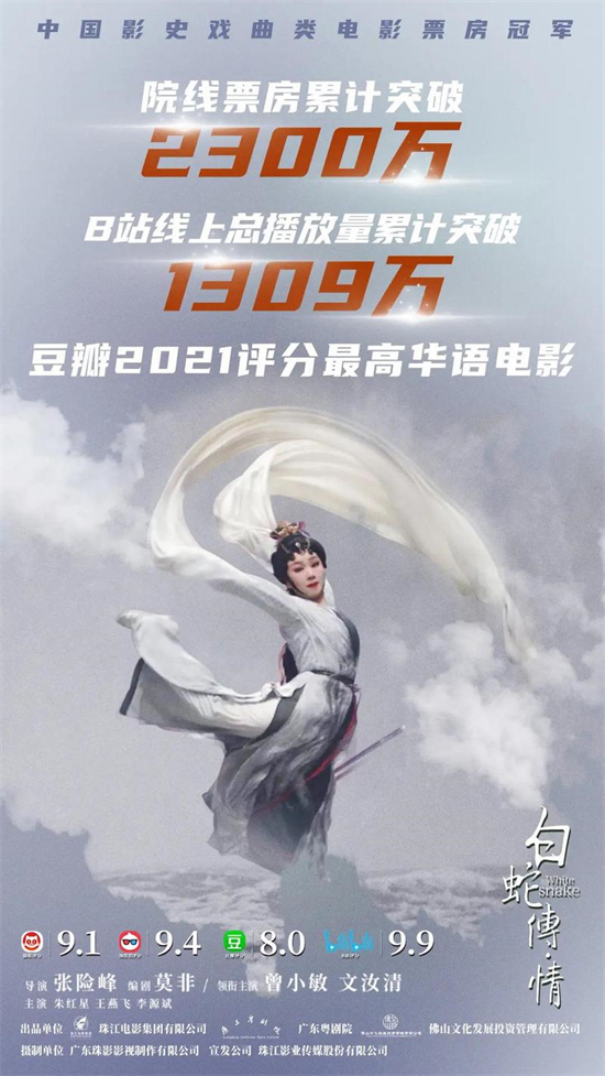 在过去的一年里,《白蛇传·情》成绩斐然:刷新戏曲片票房纪录,票房累计突破2300万元;B站线上总播放量累计突破1300多万,评分9.9;成为豆瓣 2021评分最高华语片,评分8.0;此外,淘票票评分9.4,猫眼评分9.1……影片代表中国传统文化在年轻人中“出圈”,带起一股国风新浪潮。