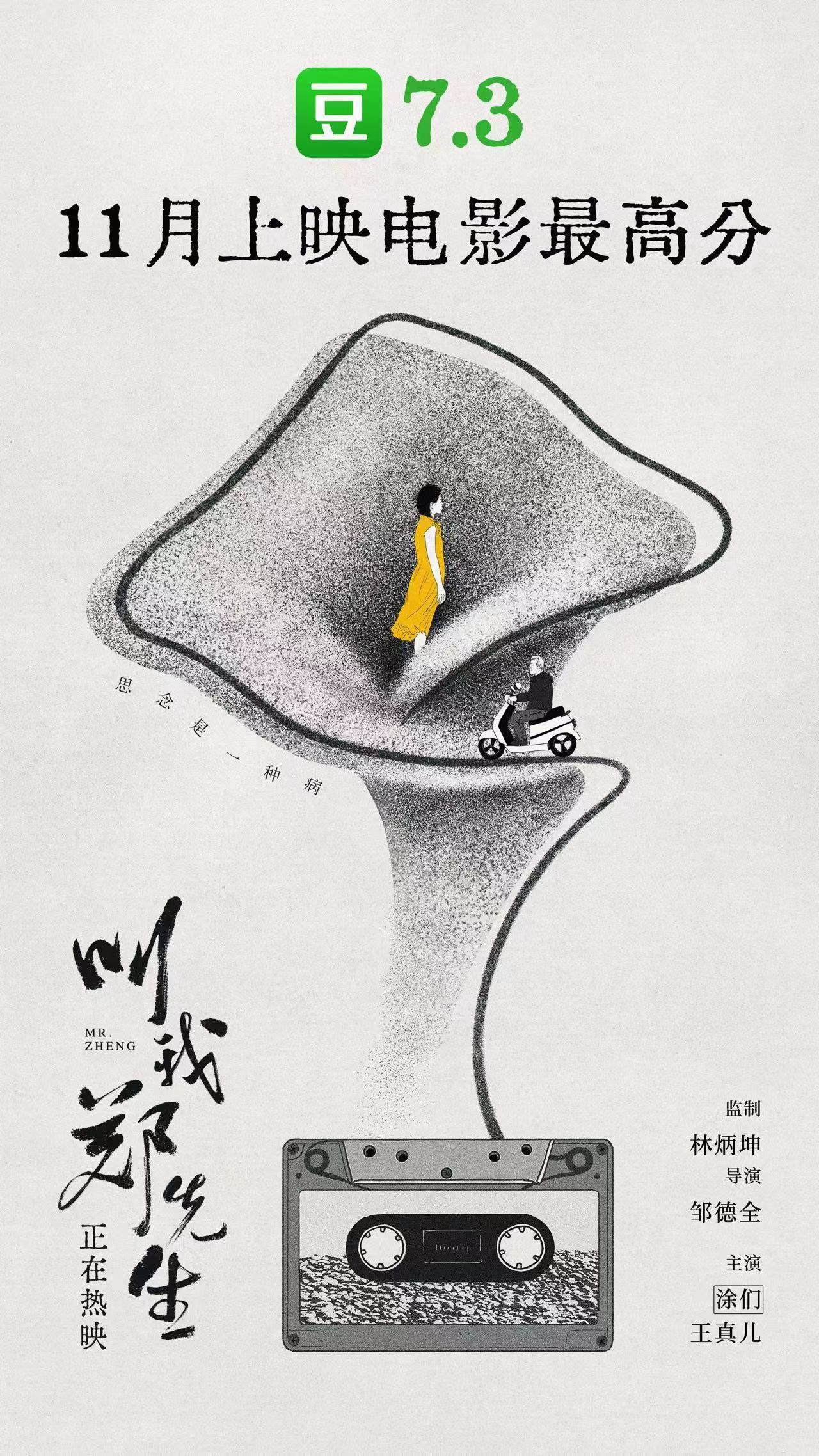 11月8日,由林炳坤监制,邹德全执导,斩获多个电影节最佳男主角的著名演员涂们、实力演员王真儿主演的电影《叫我郑先生》在北京电影资料馆举办“好久不见”主题观影场,极致深情的思念故事引全场动容。涂们之子涂一塞出现在现场以寄相思,映后全场观众更是一起手捧马蹄莲缅怀涂们。次日,电影发布“遥望”版终极海报,郑先生的背影凝望着站在海边的背影,思念随潮涨潮落起伏,爱意缓缓流动蔓延。