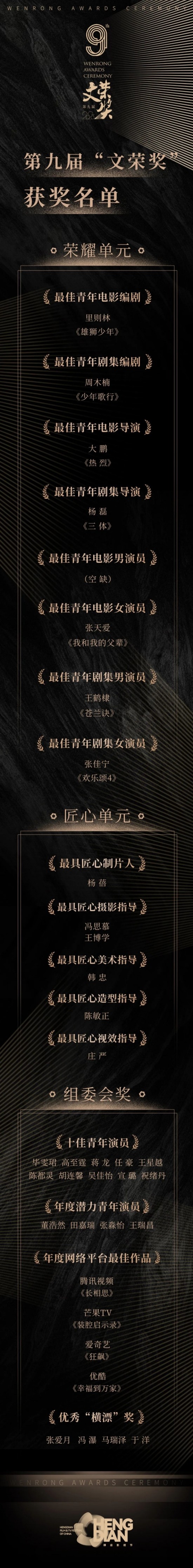 “ 荣耀横店 ” 单元的奖项包括 “ 年度最佳青年剧集 / 电影编剧 ” “ 年度最佳 青年剧集 / 电影导演 ” “ 年度最佳青年剧集 / 电影男女演员 ” 等, 他们在第九届 “文荣奖”颁奖典礼的现场举起属于他们的荣耀奖杯。