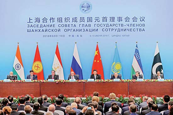 中国国家主席习近平、印度总理莫迪、哈萨克斯坦总统纳扎尔巴耶夫、吉尔吉斯斯坦总统热恩别科夫、巴基斯坦总统侯赛因、俄罗斯总统普京、塔吉克斯坦总统拉赫蒙、乌兹别克斯坦总统米尔济约耶夫出席记者会。习近平称,上海合作组织成员国、观察员国领导人以及有关国际和地区组织负责人齐聚美丽的黄海之滨,共同描绘上海合作组织进入历史新阶段的发展蓝图,并就重大国际和地区问题深入交换意见,达成广泛共识。