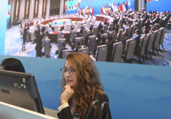 图:外国记者在新闻中心工作报道上合青岛峰会\中新社