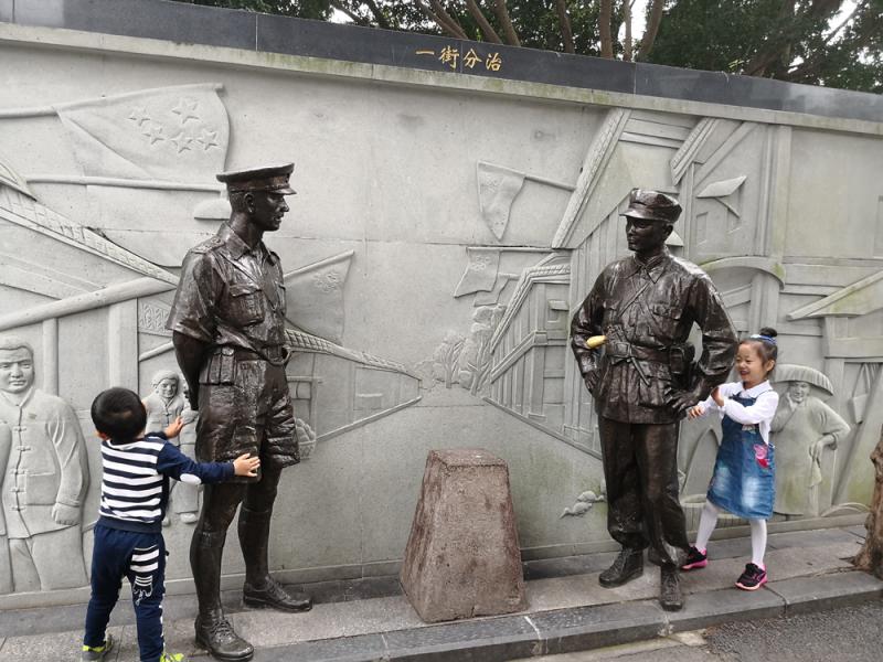 图:小游客们在中英街雕塑文化墙游玩/受访者供图