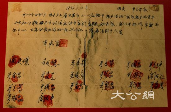 1978年11月的一个冬夜,凤阳县小岗村18户农民,签下如是契约:“我们分田到户,每户户主签字盖章,如以后能干,每户保证完成每户的全年上交和公粮,不再向国家伸手要钱要粮。如不成,我们干部坐牢杀头也甘心,大家社员也保证把我们的小孩养活到18岁。”彼时,这群衣衫褴褛的农民也没想到,一场改变中国亿万农民命运的改革实践,正由他们拉开大幕。40年过去了,“大包干”带头人之一的严立华说,当年搞“大包干”只是为了能吃饱肚子活下去,而现在过上的好生活是当时“想都不敢想的”。当年的“生死契约”,签订的地点正是严立华家。那时他家的茅草房,是全村极少拥有两进屋子的“豪宅”。现今,这房子是村里唯一的一栋茅草屋,已成为见证那段历史的旅游景点。