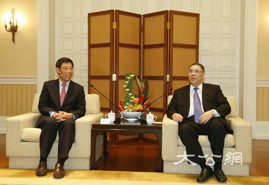 澳门特首崔世安(右)与全国政协委员、香港大公文汇传媒集团董事长姜在忠交谈。