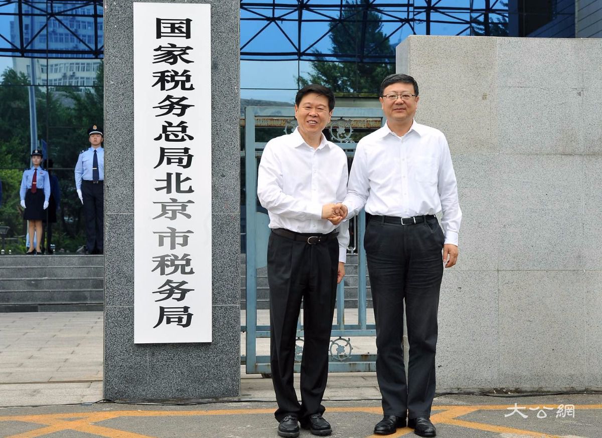 国家税务总局党组书记、局长王军与北京市委副书记、市长陈吉宁共同为国家税务总局北京市税务局揭牌。