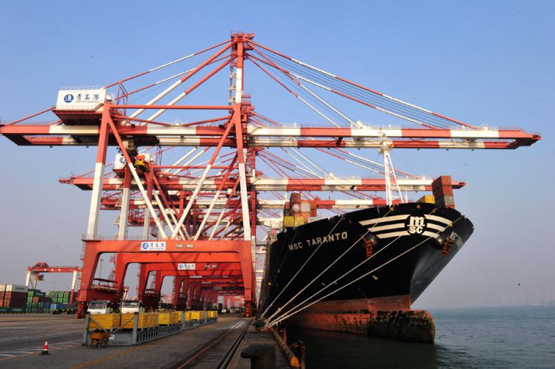 图:外轮在山东青岛港外贸集装箱码头装卸集装箱 大公报资料图片