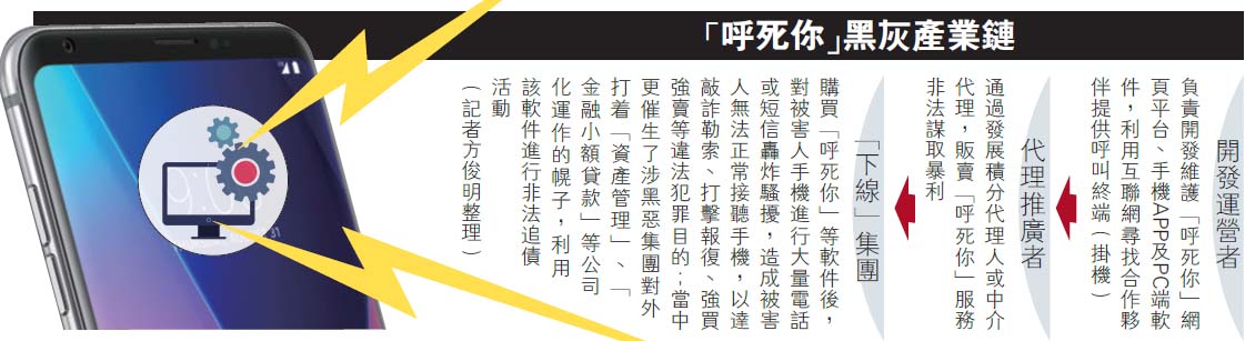 两个集团均分为“线上+线下”两个部分,“线上”人员负责开发维护“呼死你”网页平台、手机 APP及PC端软件,通过中介代理贩卖“呼死你”服务非法谋取暴利。“线下”人员通过使用“呼死你”平台实施打击报复、敲诈勒索、强买强卖、非法追债等违法犯罪,包括打着“资产管理”、“金融小额贷款”等幌子进行非法追债的三个犯罪集团。